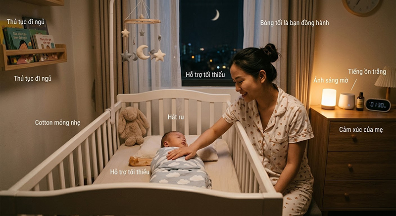 Hỗ trợ tối thiểu: Nếu con khóc, hãy chỉ bắt đầu bằng việc đặt tay lên người con, thì thầm vài câu trấn an. Chỉ khi con khóc thật sự, mẹ mới nên bế lên dỗ dành. Mục tiêu là để con hiểu rằng: "Mẹ vẫn ở đây, nhưng giờ là lúc con cần tự ngủ".