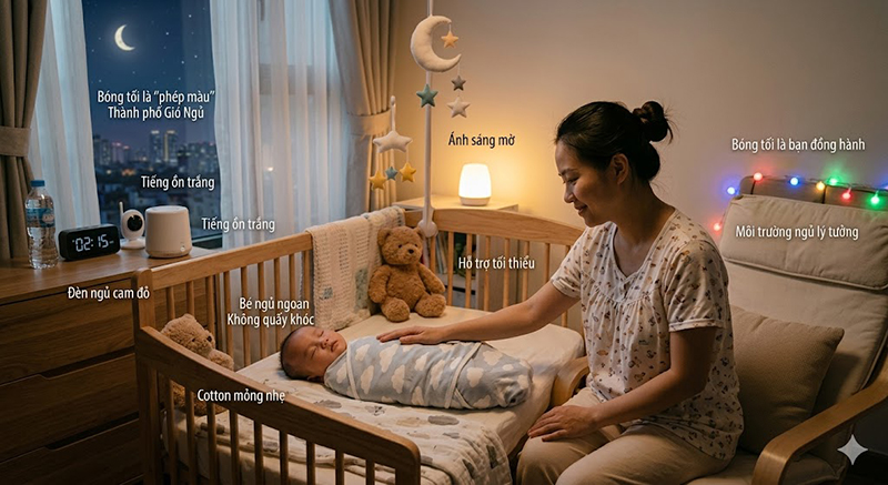 Môi trường "nghèo" oxy hoặc quá nóng: Mẹ thường sợ con lạnh nên đóng kín cửa và quấn quá nhiều lớp. Thực tế, không khí tù đọng và nhiệt độ cao (trên $27^\circ C$) là kẻ thù số một của giấc ngủ ngon.